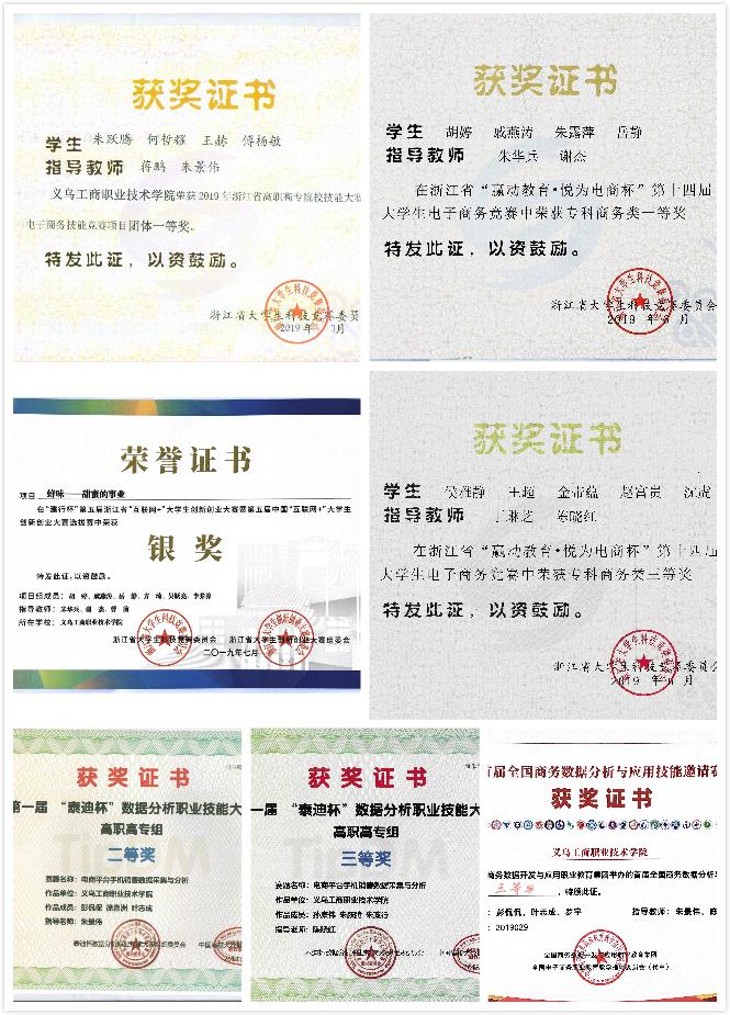 本专业2021年入选第二批国家级职业教育教师教学创新团队建设单位,浙江省双高专业群建设专业,2022年获评1+X电子商务数据分析示范试单位,“金平果”专业排名全国第11位,浙江省第3位。