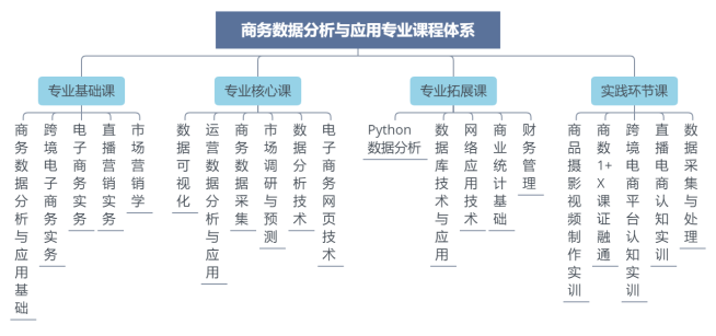 专业培养具备商务贸易领域与大数据分析领域专业知识,掌握商务管理、擅长分析工具使用、会图表设计等应用技能,能够从事商务数据分析、数据运营、商务管理与咨询和网络营销等岗位,具有较强创新意识、创业能力和商科特色鲜明的优秀复合型人才。