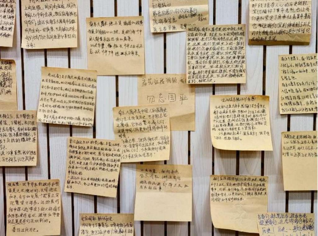 感念难抒,以笺承寄。参与活动的每一位青年学子都在便利贴上写下了个人感悟,把对死者的缅怀、对人生的期望、对先驱的感恩、对家国的承诺都浓缩在小小的便笺里,贴在留言墙上,叙臆明志。