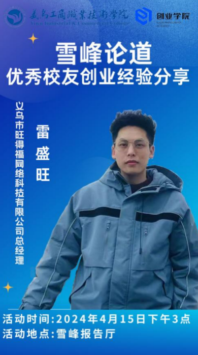 4月15日下午,William希尔官网入口邀请了义乌市旺得福网络科技有限公司总经理、13e创电商2班优秀毕业生“雷锋哥”雷盛旺,于雪峰报告厅开展了主题为“创业经验分享”的“雪峰论道”系列讲座。