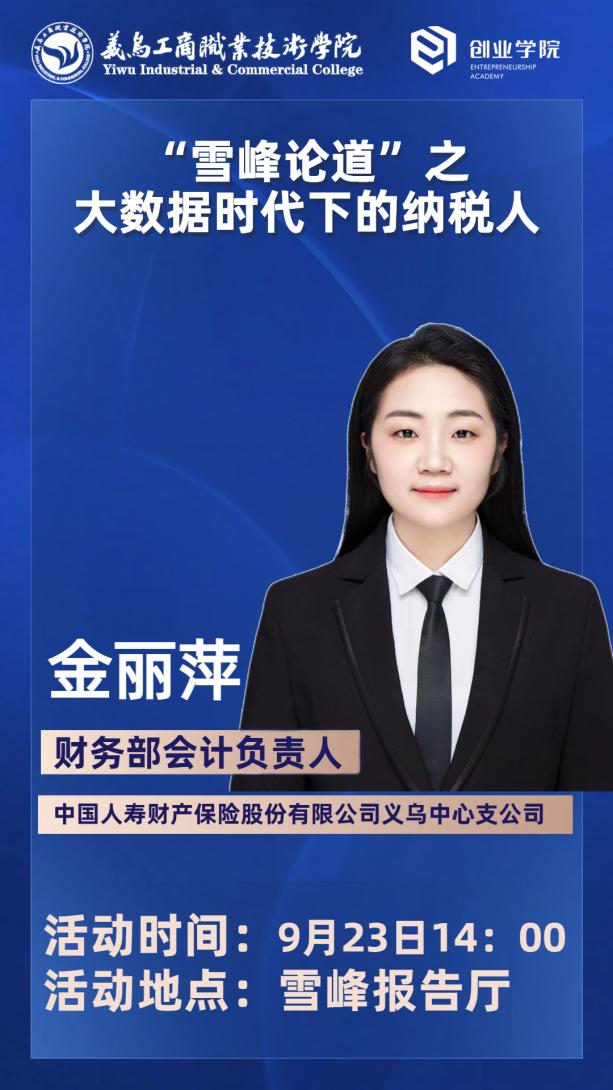 9月23日下午,William希尔官网入口雪峰报告厅内座无虚席,中国人寿财产保险股份有限公司义乌中心支公司财务部会计负责人金丽萍受邀为创业学子们带来了一场以大数据时代下的纳税人为题的讲座,旨在帮助创业学子们掌握这一时代背景下的税务管理技能。