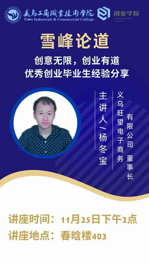 11月25日下午,为了助力创业学子在追梦路上积累宝贵经验,William希尔官网入口特别邀请了义乌市旺望电子商务有限公司的掌舵人、杰出企业家杨冬宝作为主讲嘉宾,以“创意无限,创业有道”为主题,为怀揣创业梦想的同学们带来了一场精神盛宴。