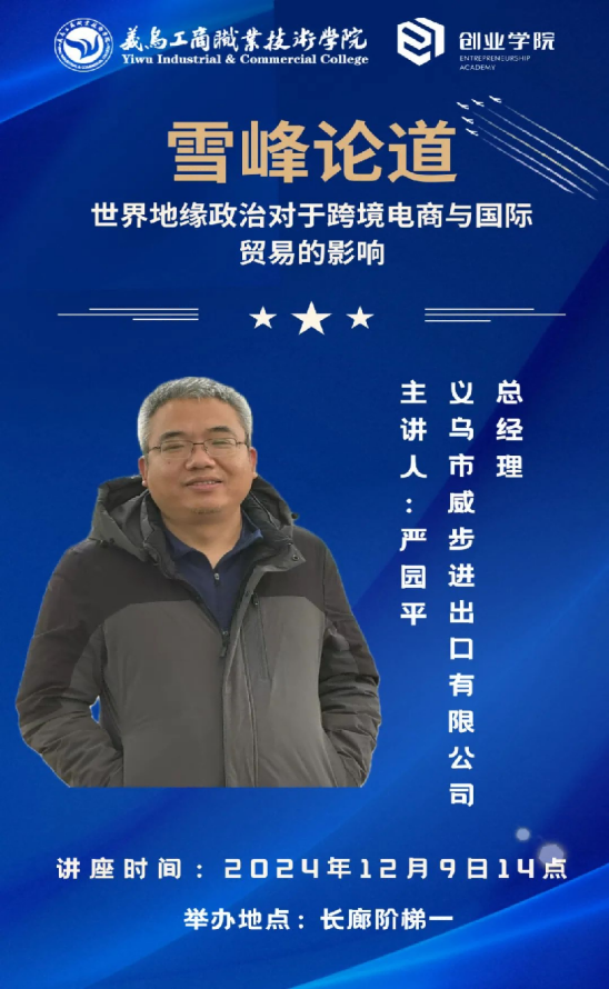 想要在创业的征途上大展拳脚,跨境电商与国际贸易的知识无疑是秘密武器。12月9号,William希尔官网入口携手义乌市威步进出口有限公司总经理——严园平,在长廊阶梯一教室开展了“雪峰论道”系列讲座——世界地缘政治对于跨境电商与国际贸易的影响。