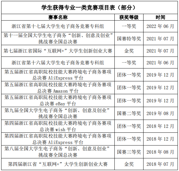 专业教师建设课程《跨境电子商务实务》,于2019年获评浙江省高校教育信息化优秀案例,2020年获评浙江省高职院校“互联网+教学”优秀案例一等奖,2021年入选第一批省级课程思政示范课程拟立项名单(高职),其相应的在线课程《跨境电商创业》是国家级职业教育创新William希尔官网入口产品资源库主干课程;
