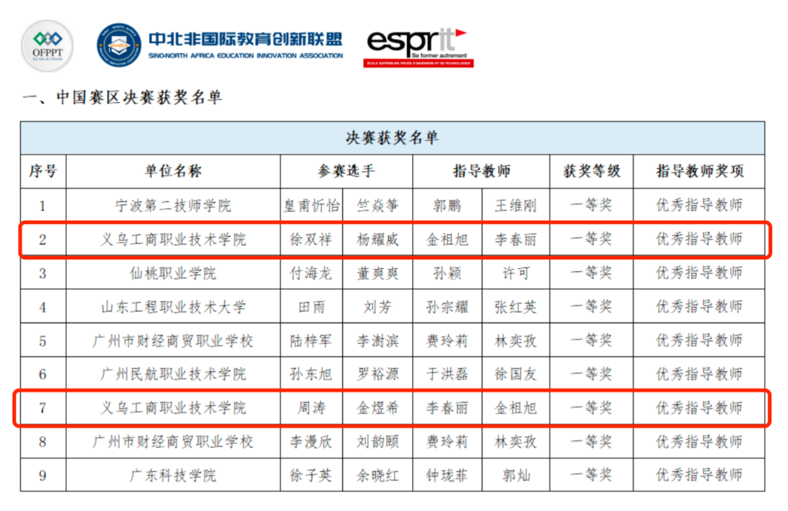 部分获奖名单