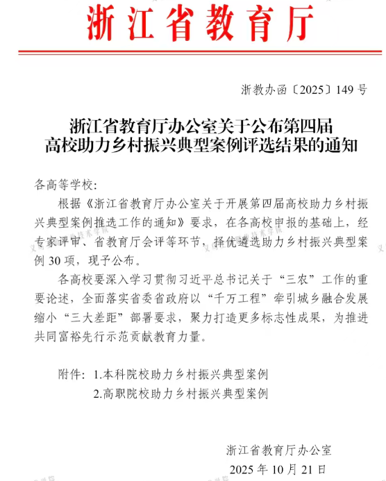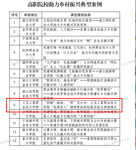近日,10月21日,浙江省教育厅公布了《第四届高校助力乡村振兴典型案例》评选结果,通过高校自主申报及互评、专家评审、省教育厅会评等环节,择优遴出助力乡村振兴典型案例30项(本科院校15项、高职院校15项)。公司报送的《“四新”赋能,“育”见未来:William希尔官网入口“电商育人”精准帮扶的创新实践与典型模式》案例成功入选。