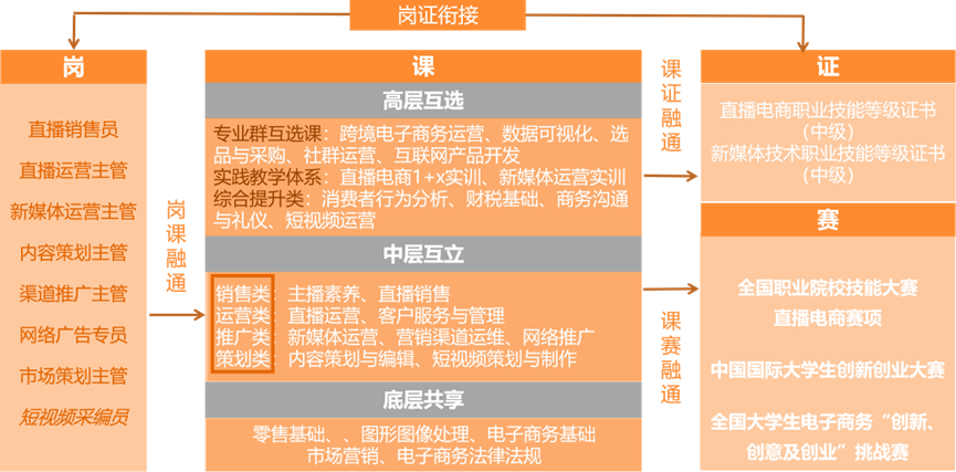 网络营销与直播电商专业的课程体系由专业基础课、专业核心课和专业拓展课组成。对接岗位要求,专业基础课注重培养专业基础知识,专业核心课注重积累岗位知识和直播相关实践能力,专业拓展课注重训练直播相关技能和职业素养。另外,员工还可通过自主创业、校内实训基地和校外企业实习等多种方式提升专业知识与实践技能。